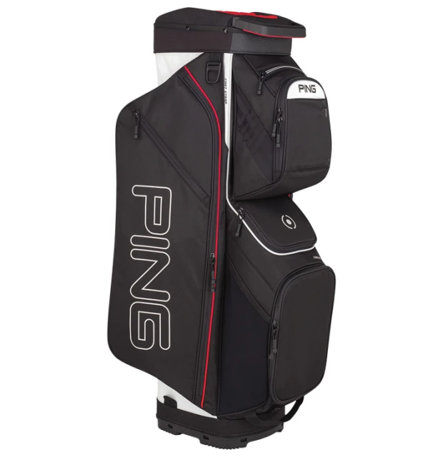Lækker Cartbag taske fra Ping. Tasken har 2 store inddelinger til overdimensioneret greb i 14-vejs toppen. Den har i alt 13 lommer til at dit udstyr heriblandt en kølerlomme, boldlomme og en range-finder lomme.