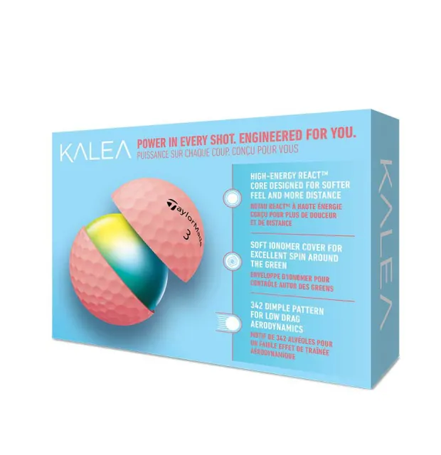 TaylorMade Kalea er golfbolden til at slå langt med. Det er en meget blød bold med en kompression på 60. Det betyder at den specielt er rigtig god til dig, som ikke slår mega hårdt. Den er bygget med 2 lag og dimplerne på bolden hjælper med at holde bolden i luften længere tid.