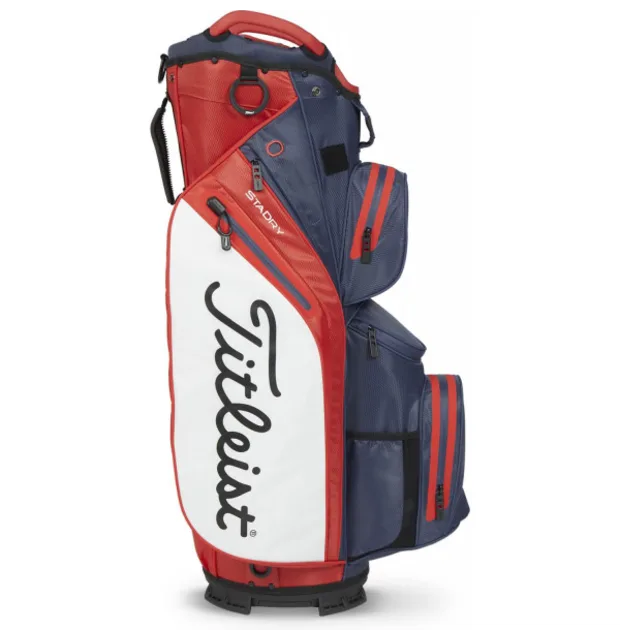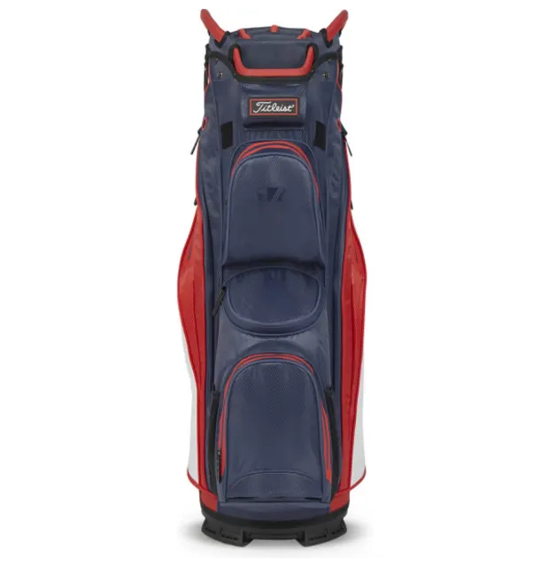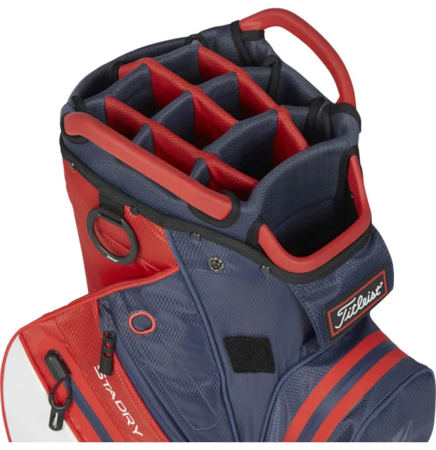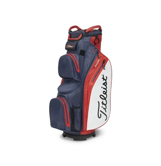 Titleist har med deres Cart 14 bag lavet et symmetrisk design, med 10 lommer, så du kan opbevare værdigenstande, bolde og drikkevare på runden. Toppen er med 14 inddelte rum, så ens jern og køller ikke rammer ind i hinanden i bunden. Deres brug af StaDry gør at tasken er vandtæt og derfor kan bruges i alt slag vejr..
